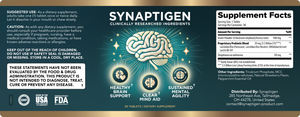 Synaptigen is the ultimate natural solution for anyone looking to sharpen memory, boost focus, and maintain mental clarity well into old age. Its advanced formula combines clinically studied probiotics, prebiotics, and plant-based nutrients that work together to nourish the brain, support neuron communication, and protect cognitive function over time.